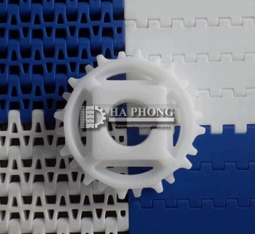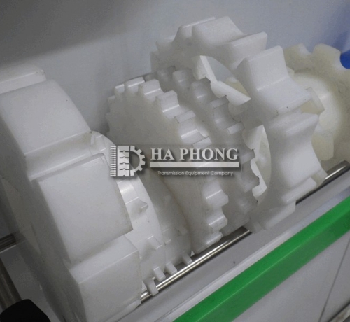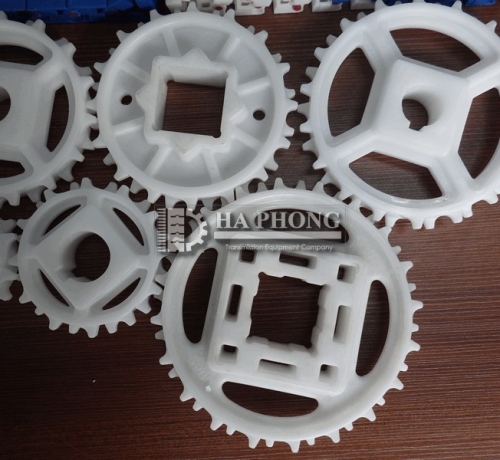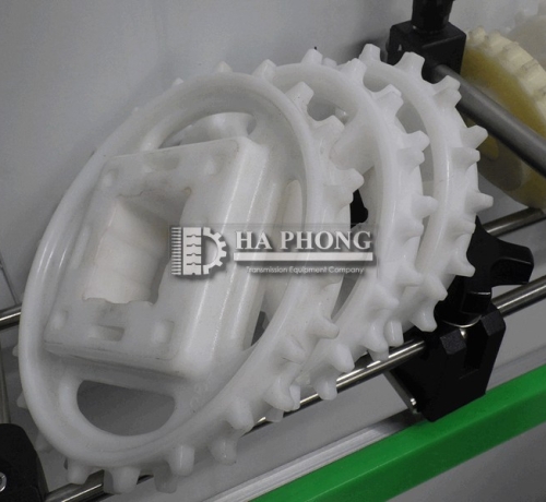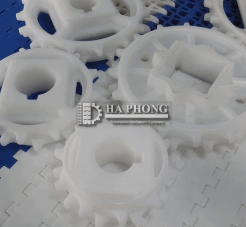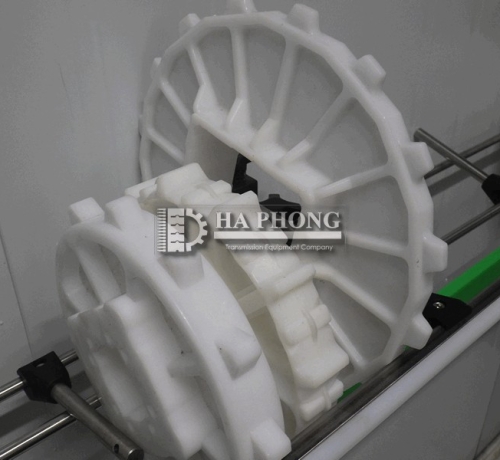 Lưu ý: băng tải nhựa nên dùng bánh nhông nhựa trừ các trường hợp thì mới dùng bánh nhông băng kim loại, Băng tải nhựa dùng bánh nhông bằng kim loại sẽ làm mòn băng tải.